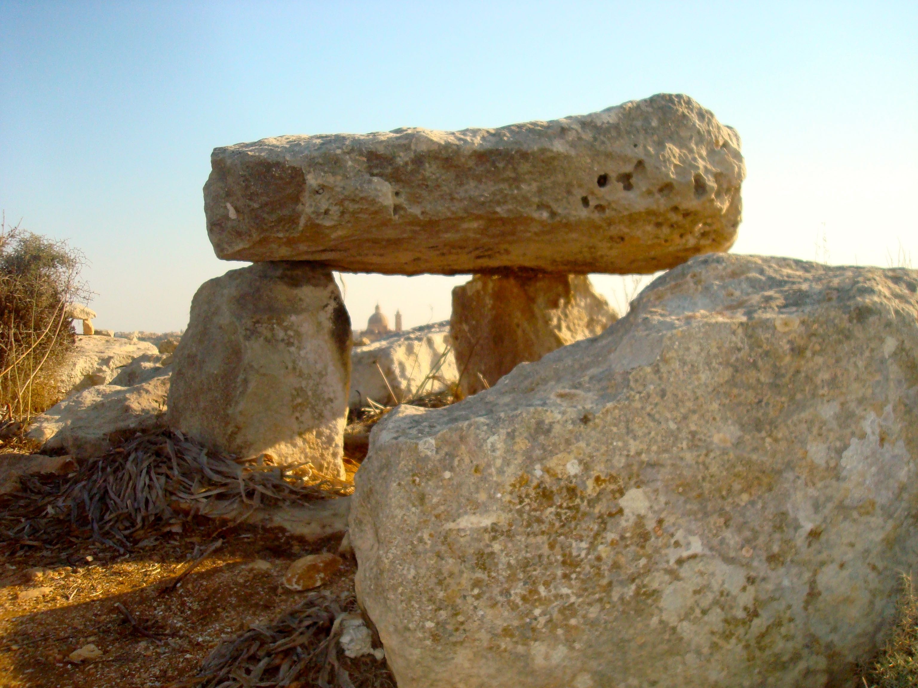 The absurdly large church in Xewkija seen over the dolmen of Ta’Cenc and…